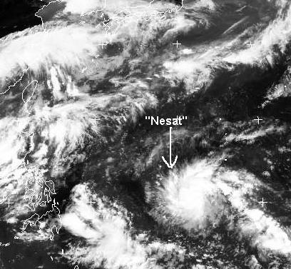 Über den Mikronesien wirbelt sich der tropische Sturm 'Nesat' auf, nach dem jetzigen Stand entwickelt er sich in den nächsten Tages zu einem Taifun mit Windgeschwindigkeiten von 210, in Böen bis zu 260 km/h und verlagert sich östlich von den Philippinen und Taiwan nordwärts, sein Endziel ist noch unklar.