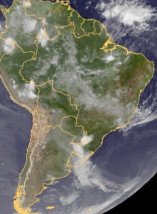 Das heutige Satellitenfoto von Südamerika zeigt über Brasilien vielfach starke Bewölkung. Dabei treten vor allem in Westbrasilien verbreitet kräftige Schauer auf.