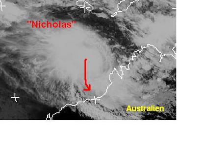 Der Wirbelsturm 'Nicholas' vor der Nordwestküste Australiens hat sich verstärkt. Zurzeit erreicht er mittlere Windgeschwindigkeiten von 111, in Böen 139 km/h. Berechnungen zufolge soll er sich noch etwas verstärken, und Richtung Süden auf die australische Küste zuziehen. Sein Endziel ist noch unklar. (Bildquelle: NERC Satellite Receiving Station, Dundee University, Scotland, http://www.sat.dundee.ac.uk/)