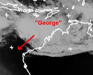 Im Indischen Ozean, nordwestlich von Australien befindet sich der Zyklon 'George'. Seine mittleren Windgeschwindigkeiten erreichen zurzeit 120, in Böen 150 km/h. Auf seinem Weg nach Südwesten soll der Zyklon sich weiter verstärken. Dabei kann es an der Nordwestküste Australiens zu ergiebigen Regenfällen und Sturm kommen. (Bildquelle: NERC Satellite Receiving Station, Dundee University, Scotland, http://www.sat.dundee.ac.uk/)