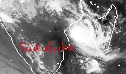 Der tropische Zyklon 'Jokwe' zieht gegenwärtig weiter Richtung Süden und liegt heute in der Meerpassage zwischen Madagaskar und dem afrikanischen Festland. Er hat sich seit gestern etwas abgeschwächt und weht durchschnittlich noch mit Windgeschwindigkeiten um 130 km/h und Böen von bis zu 190 km/h.