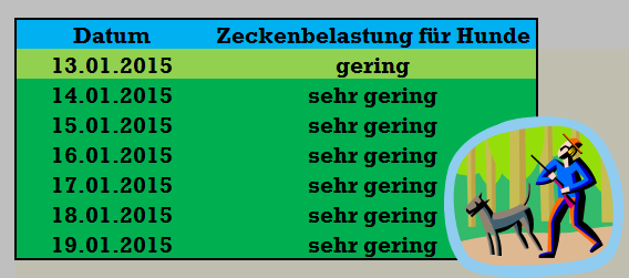 Das milde Wetter hat an unseren Messstellen die Zecken aktiviert. Da es ab Donnerstag etwas kälter wird, beruhigt sich die Aktivität zum Ende der Woche hin wieder, das Hundezeckenrisiko ist dann wieder als gering einzustufen.