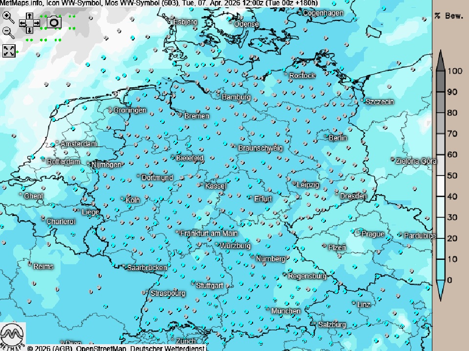 Die Wetter- und Temperaturkarte für Dienstag (07.04., 12:00 Uhr) nach ICON: