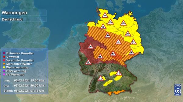 Für weite Landesteile bestehen aktuelle Unwetterwarnungen bzw. Vorwarnungen bis einschließlich Sonntagabend (07.02., 20 Uhr).