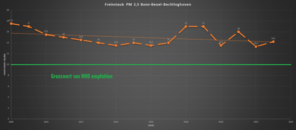 Die Coronajahre 2020 und 2021 beendeten den Aufwärtstrend aufgrund der Lockdowns, dem Trend hin zu Homeoffice und den ausgebliebenen Silvesterfeuerwerken zwar (letztere, aber auch vorherrschende Großwetterlagen spielen bei der Jahresgesamtbilanz übrigens eine erhebliche Rolle und tragen einen nicht unerheblichen Anteil zum gesamten jährlichen Feinstaubausstoß bei); vor allem im Jahr 2021 fällt aber auf, dass trotz der genannten Umstände der Jahresmittelwert viel zu hoch war - und sich, wie in allen Vorjahren, deutlich über dem WHO-Grenzwert von 10 µg/m³ bewegt.