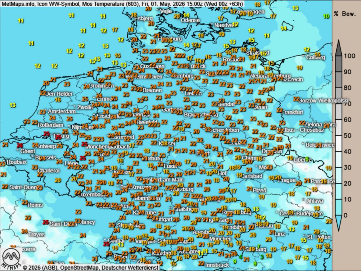 Temperaturabweichung und Temperatuen 01.05. (15:00 Uhr) nach Icon