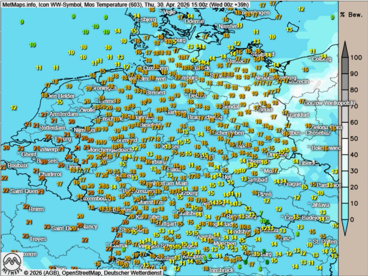 Auch im Norden und Osten wird es mit Werten um die 22 °C angenehm mild.