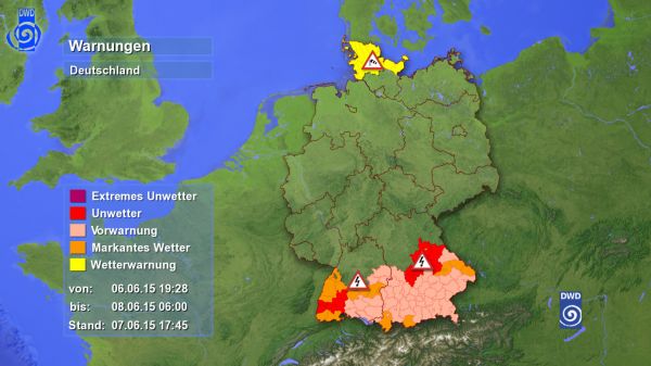 Bis Mitternacht treten noch zwischen Schwarzwald und Bayerischem Wald Schauer und Gewitter auf. Aktuelle Prognosen auch in der 2-Stunden-Vorhersage. Es bestehen Unwetterwarnungen.