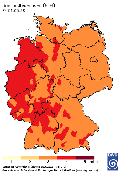 Erst Niederschläge wirken hier als natürliche Bremse. Der GFI wird in Stufen von 1 (sehr gering) bis 5 (sehr hoch) angegeben, wobei die Gefahrenbereiche 4 und 5 für die Feuerwehren akute Alarmbereitschaft bedeuten.