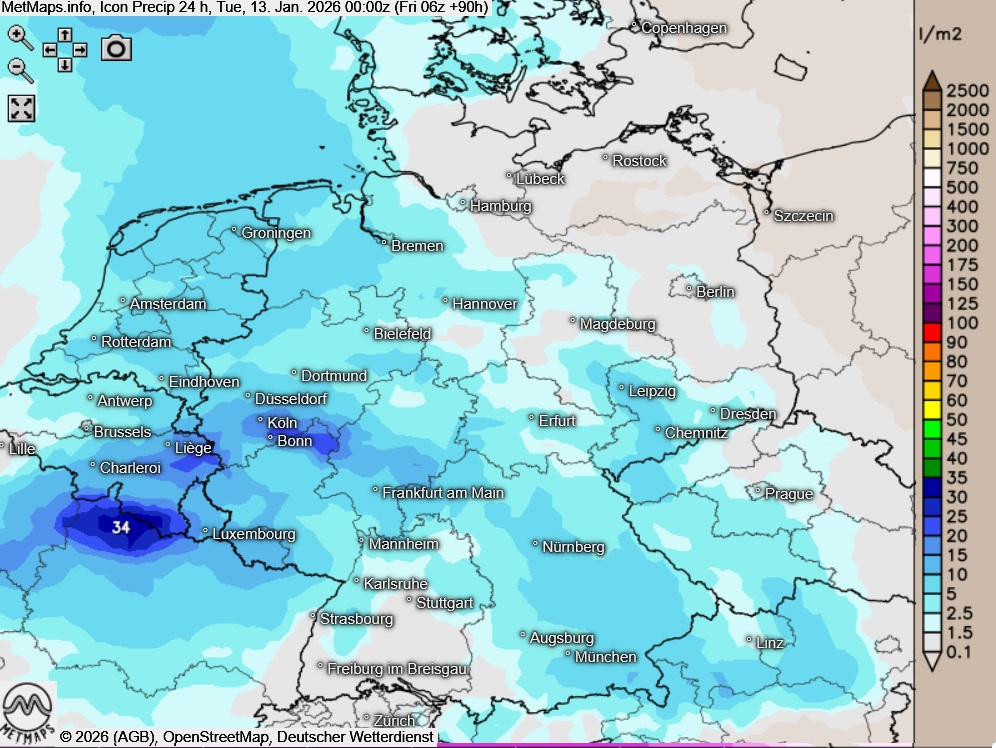 Die Temperaturanomalien kombiniert mit den bodennahen Wettervorhersagen aus dem MOS nach GFS sowie die 24-Stunden-Niederschlagsmengen für Montag nach ICON: