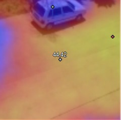 In diesen heißen Tagen zeigen sich Hitzeausdehnungen mit erheblichen Schäden auf Asphalt- und Betonflächen auf unseren Straßen. Die gemischte Bildaufnahme im sichtbaren Bereich und im Wärmebereich, zeigt die Oberflächentemperatur einer hellen Betonfläche bei 28 Grad C Außentemperatur und starkem Wind. Sie ist an der wärmsten Stelle rund 45 Grad C warm. Bei schwachem Wind sind bei 35-40 Grad C Lufttemperatur, Oberflächentemperaturen von 60 bis 65 Grad C denkbar. Auf Asphaltflächen sind sogar bis zu 75 oder gar 80 Grad C gemessen worden. Der Asphalt wird dann flüssig und verformt sich.