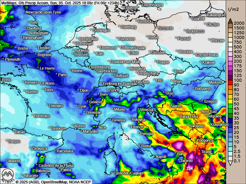 Die akkumulierten Niederschlagssummen für Europa bis zum 05.10.2025 (18 Uhr) nach GFS: