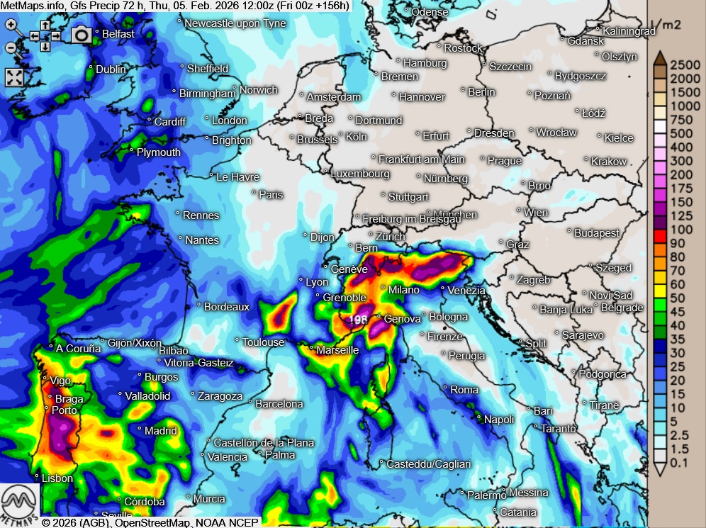 Vor allem in Norditalien, im Alpenraum, in Südfrankreich sowie in Teilen Spaniens und Portugals werden in kurzer Zeit große Regenmengen prognostiziert. Lokal sind im Prognosezeitraum Regenmengen um 200 Liter pro Quadratmeter möglich; begünstigt durch eine Tiefdruckzone über dem Mittelmeer und starke Staueffekte an den Gebirgen.
