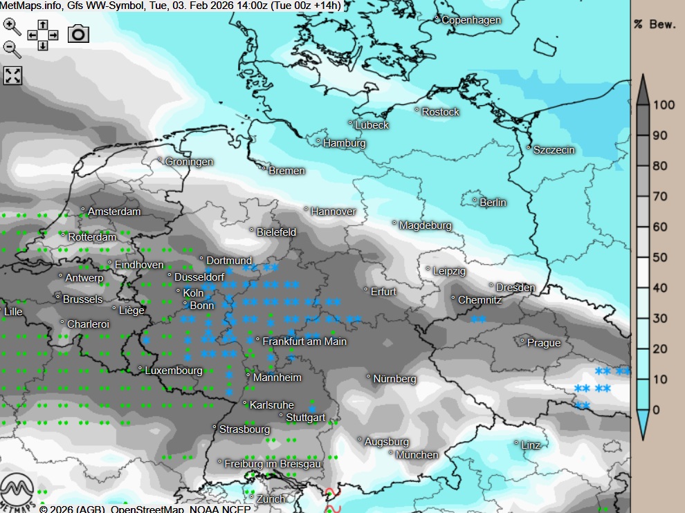 Im Folgenden die Unwetterwarnkarte, die Wetterkarte für 14:00 Uhr sowie die akkumulierten Schneemengen bis 20:00 Uhr nach GFS: