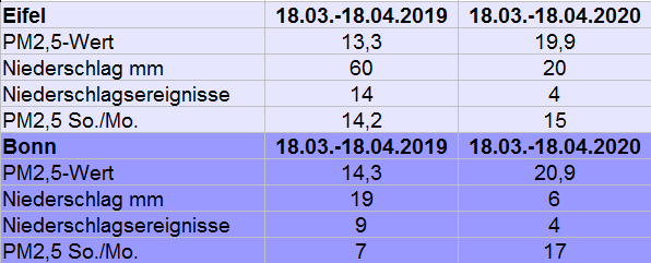 Die Corona-Pandemie zwingt uns seit Mitte März zu erheblichen Einschränkungen in unserem Leben. Etwa seitdem verhält sich auch die Luftqualität an zwei unserer Messstationen am Weißen Stein in der Eifel sowie in Bonn ähnlich: Beide Stationen, die eine im städtischen Hintergrund in Bonn, die andere am Weißen Stein auf  700 m Höhe, weisen für den Zeitraum 18. März bis 18. April einen mittleren Feinstaubwert von 21 bzw. 20 ug/m³ aus.