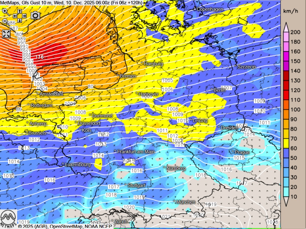 Vor allem den nördlichen Teilen Deutschlands könnten in der neuen Woche unruhige Zeiten bevorstehen: Für den Mittwoch rechnen viele Wettermodelle zur Zeit mit einer schweren Sturmlage, das US-Modell GFS weist für die frühen Morgenstunden des 10. Dezember sogar orkanartige Böen (Windstärke 11) um 116 km/h aus. Ab einer Windgeschwindigkeit von 117 km/h ist die volle Orkanstärke / Windstärke 12 erreicht.