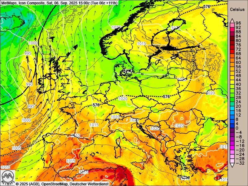 Die Strömungskarte für Samstagnachmittag und die Lufttemperaturen Europa am Sonntagnachmittag nach ICON. Die dritte Karte bildet die akkumulierten 48-Stunden-Regenmengen bis Sonntagabend ab.