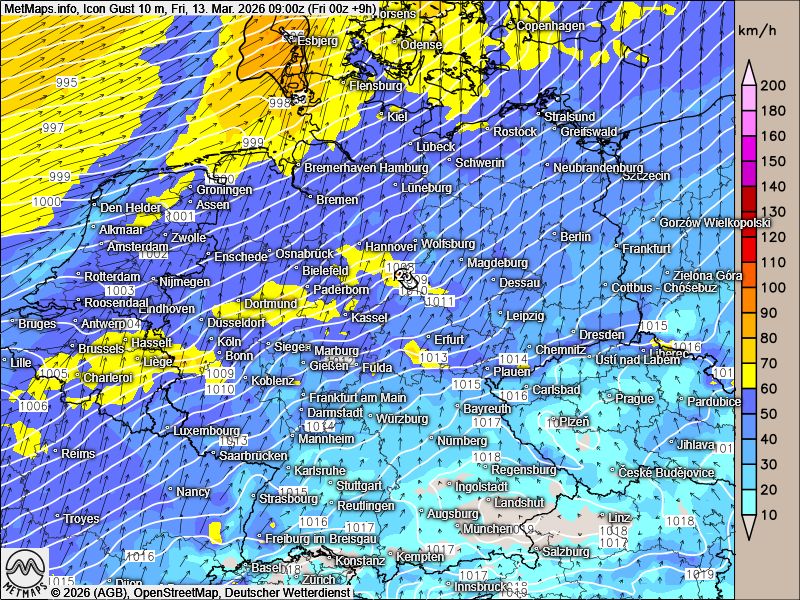 Die Böenkarte für Freitag (09:00 Uhr), die 24-Stunden-Regenmengen bis Samstagmittag (12:00 Uhr) sowie die 12-Stunden-Schneemengen bis Samstagmorgen (09:00 Uhr) nach ICON: