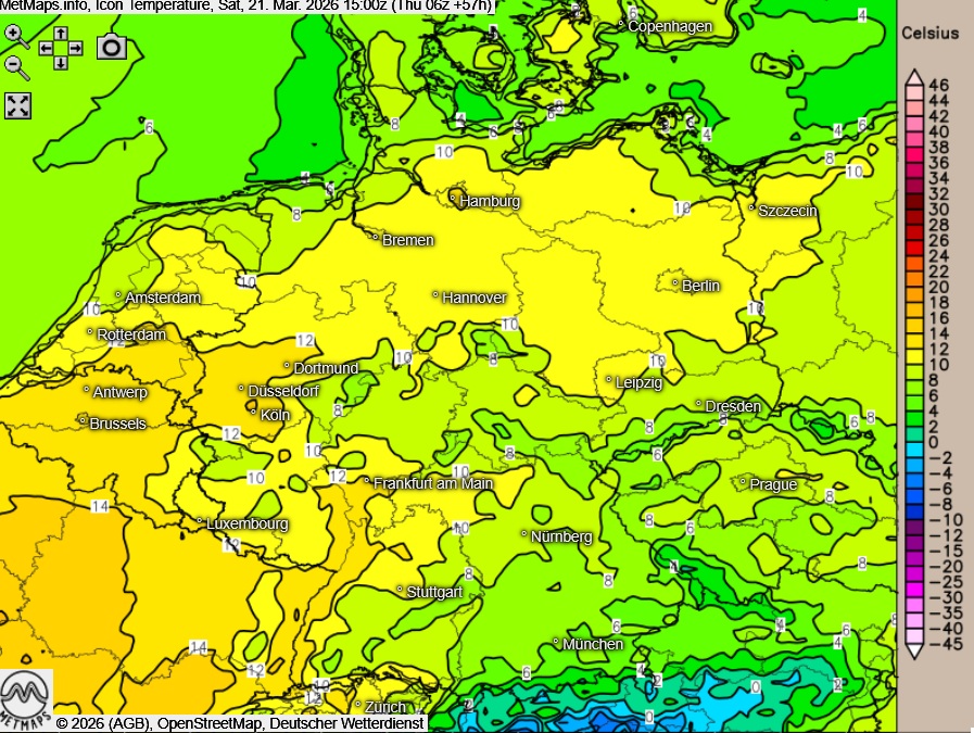 Die Temperaturen erreichen am Freitag Höchstwerte zwischen 10 Grad an den Küsten und 16 Grad am Oberrhein. Am Samstag werden in Oberbayern bei starker Bewölkung nur noch rund 8 Grad erreicht, im Rheinland steigen die Temperaturen auf bis zu 16 Grad an.