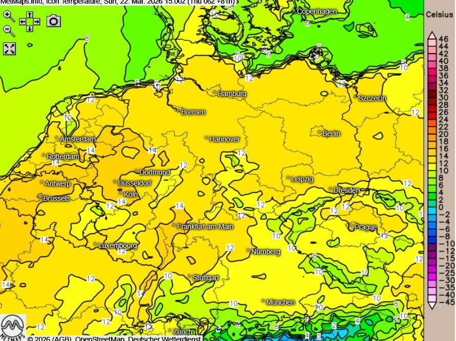 Am Sonntag wird es dann auch im Süden wieder etwas milder: Hier um 10 Grad, sonst Temperaturspitzen um 12 und 15 Grad.