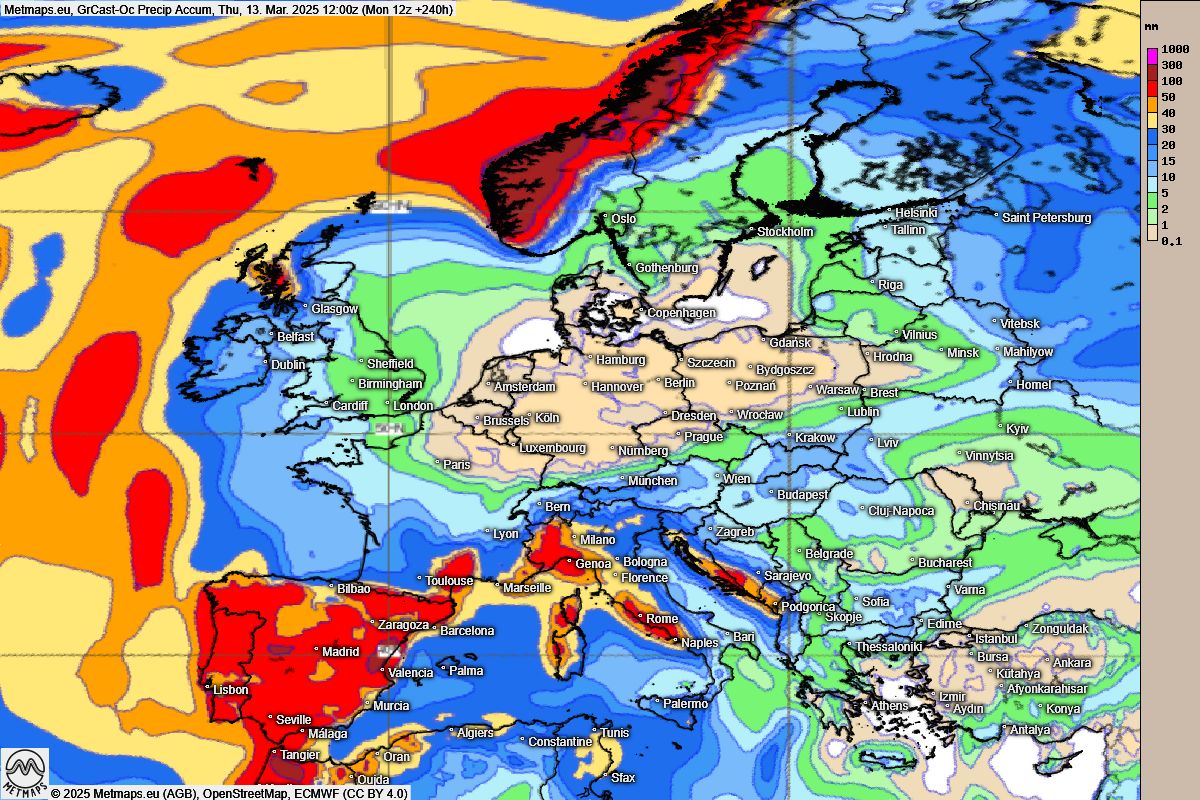 Wie auch in der KI-Prognose von Graphcast/Google abgebildet, herrscht in Sachen Niederschlag möglicherweise sogar bis Ende nächster Woche sprichwörtlich Ebbe: