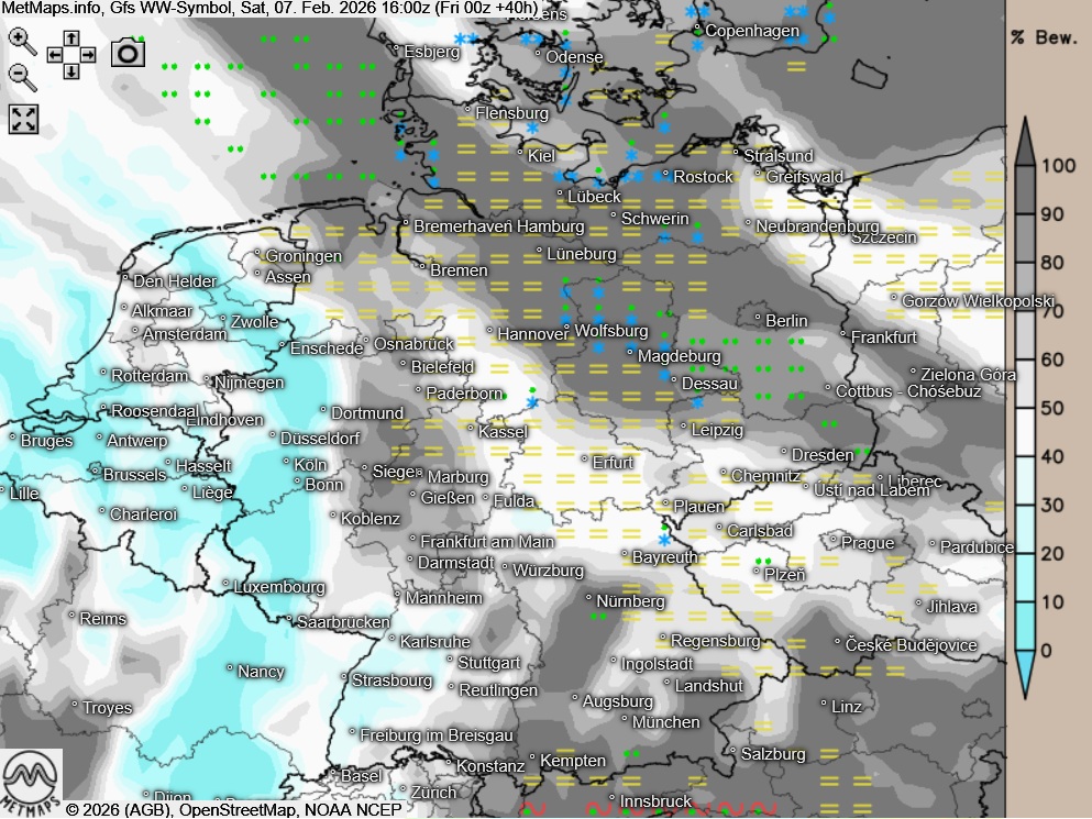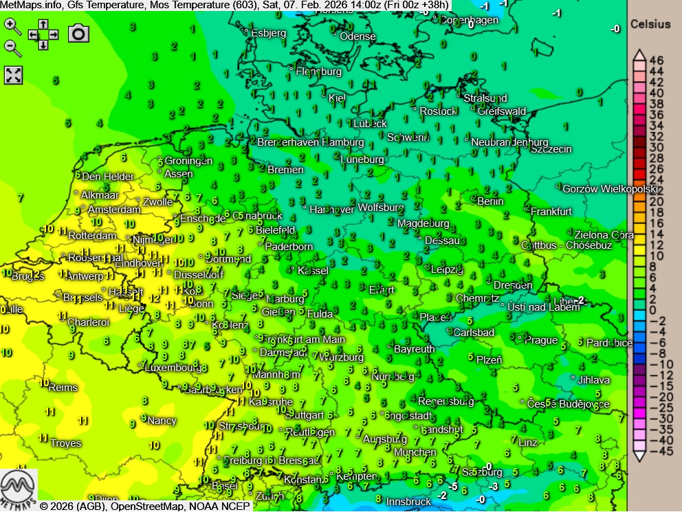 Die Wetter- und Temperaturkarten für Samstagnachmittag nach GFS: Im Westen und Südwesten erreichen die Temperaturen bei Sonnenschein morgen Werte bis zu 14 Grad, im Nordosten hingegen muss bei Höchstwerten um den Gefrierpunkt regional wieder mit Schnee und Glätte gerechnet werden.
