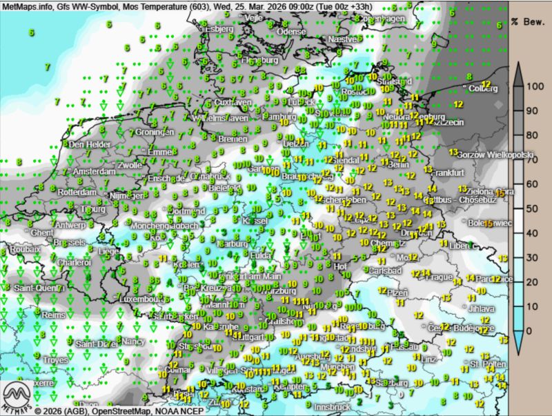 Begleitet wird der Wetterumschwung von einem markanten Temperaturrückgang. Bei anhaltendem Schauerwetter gehen die Werte spürbar zurück und erreichen teils nur noch etwa die Hälfte des zuvor gemessenen Niveaus. In der Nacht zum Donnerstag fällt ab 400 m der erste Schnee.