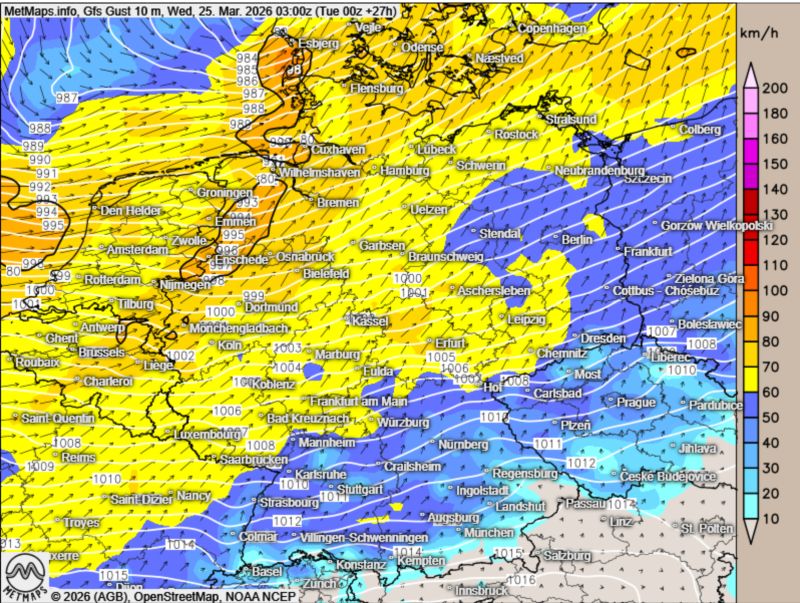 Doch auch im Binnenland wird es unruhig: In weiten Teilen Deutschlands sind stürmische Böen zu erwarten, die sich bis in die südlichen Mittelgebirge hinein bemerkbar machen dürften.