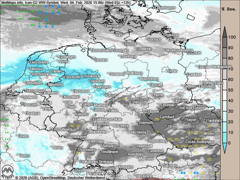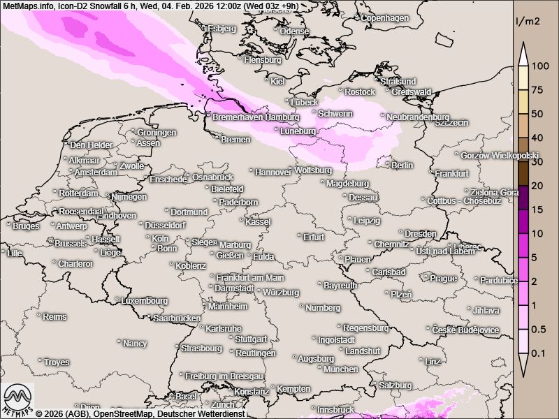 Im Folgenden ein Überblick über die erwarteten Schneemengen bis zum Mittag sowie den die Wetterkarte für Mittwochnachmittag: