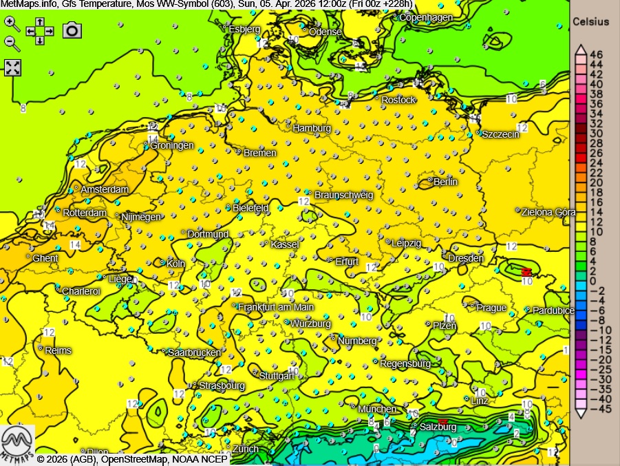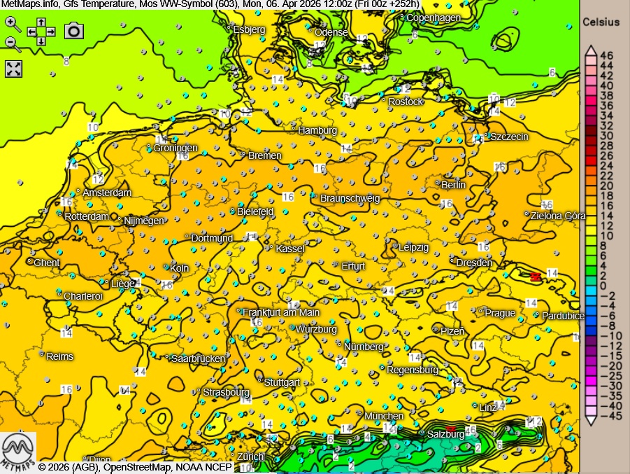 Wetter / Temperaturen an Ostermontag (12:00 Uhr) GFS