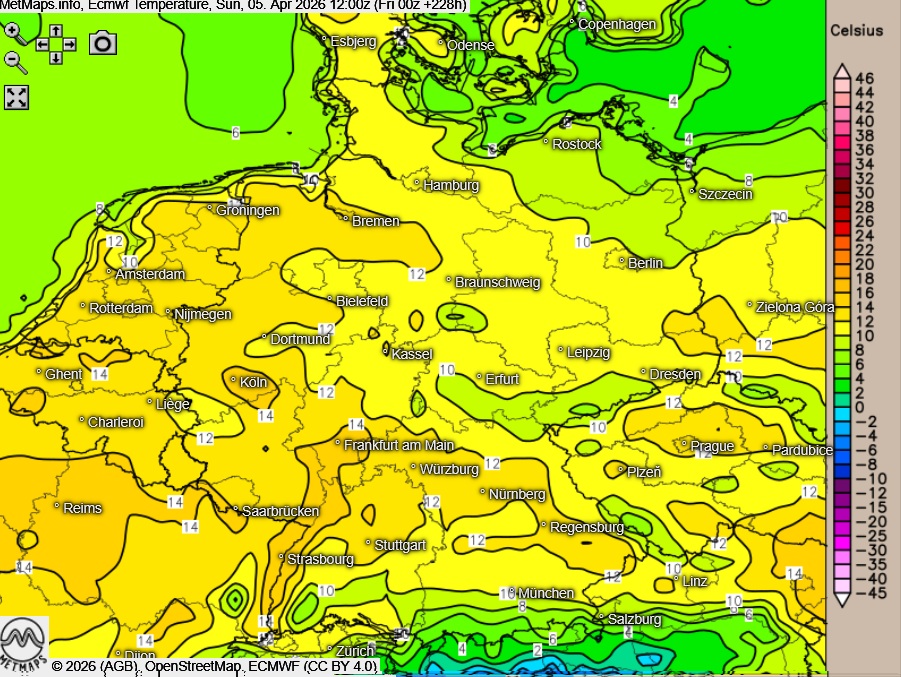 Deutlich verhaltener zeigt sich dagegen ECMWF: Das europäische Wettermodell ordnet die Höchsttemperaturen am Ostersonntag lediglich zwischen 6 und 14 Grad ein, am Ostermontag sogar nur zwischen 4 und 12 Grad. Damit bleibt es insgesamt spürbar kühler als in der GFS-Prognose. In früheren Läufen hatte das Modell für den Ostersonntag sogar zeitweise Schneesignale angedeutet.