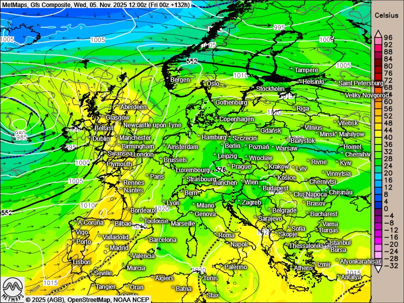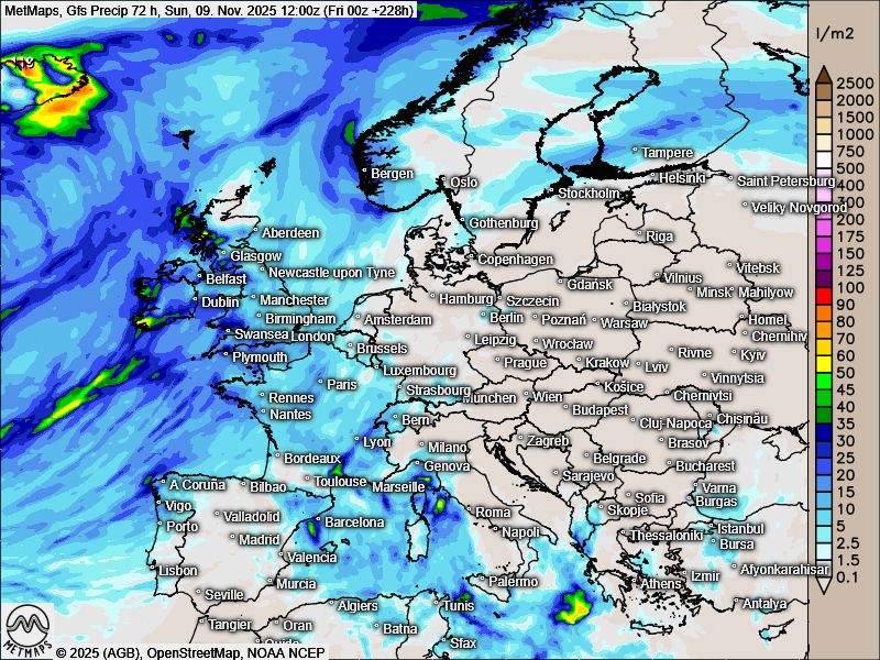 Die Strömungskarte für Mittwochmittag (05.11.) sowie die 72-Stunden-Regenmengen nach GFS bis kommenden Sonntag (09.11) nach GFS: