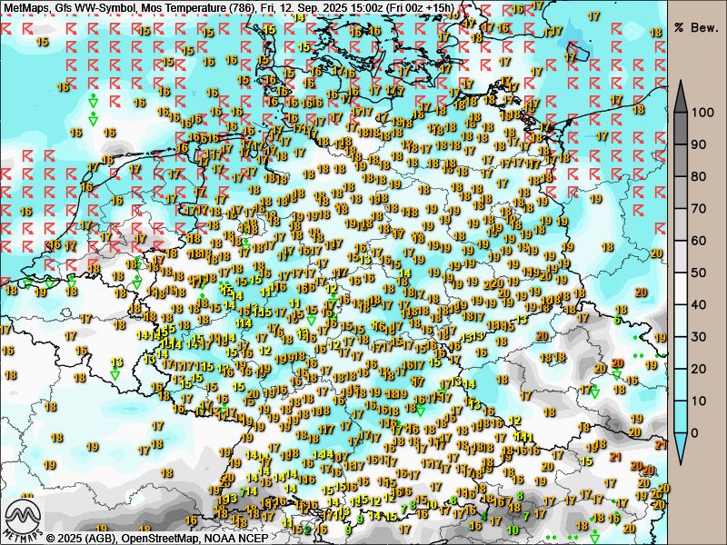 Zum Wochenende erwartet uns die erste typische Herbstlage des Jahres: Die warmen Meere bringen den Küsten schon heute Schauer und Gewitter - hier zu sehen in der GFS-Prognose für Freitagnachmittag: