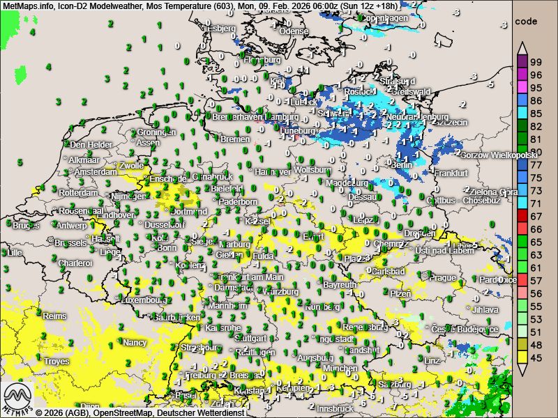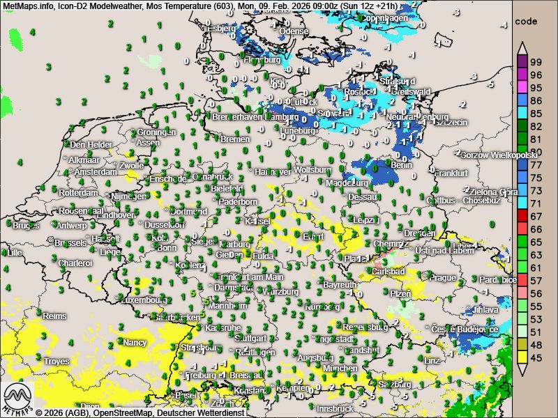 Bei Temperaturen knapp unter 0 Grad C treten verbreitet leichter Schneefall, gefrierender Sprühregen sowie Schneegriesel auf. Zusätzlich kommt es regional zu eingeschränkter Sicht durch Nebel, der stellenweise dichter ausfallen kann. Autofahrer und Fußgänger sollten erhöhte Vorsicht walten lassen.