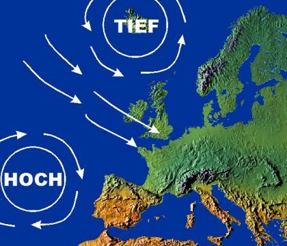 Eine starke Westwindströmung entsteht für uns in Mitteleuropa vor allem dann, wenn sich ein Hochdruckgebiet auf dem Atlantik in Höhe der Azoren bildet und ein Tief über oder bei Island. Denn um ein Hochdruckgebiet wird die Luft bei uns auf der Nordhalbkugel im Uhrzeigersinn gewirbelt, um ein Tief im Gegenuhrzeigersinn. Zwischen dem Hoch und dem Tief wird die Luft wie zwischen den Quirlen eines Mixers in Richtung Osten gepustet, für uns herrscht als Westwind:
