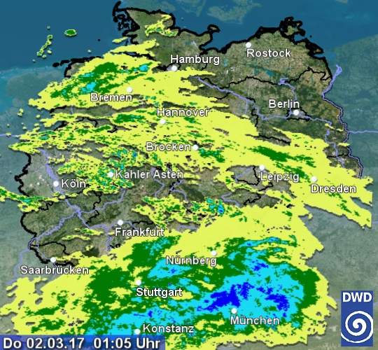 Das Radarbild zeigt uns in Süddeutschland ein ausgeprägtes und recht intensives Regengebiet. Hier können in der Nacht teilweise über 20 Liter / m² fallen. Auch sonst fällt häufig leichter bis mäßiger Regen.