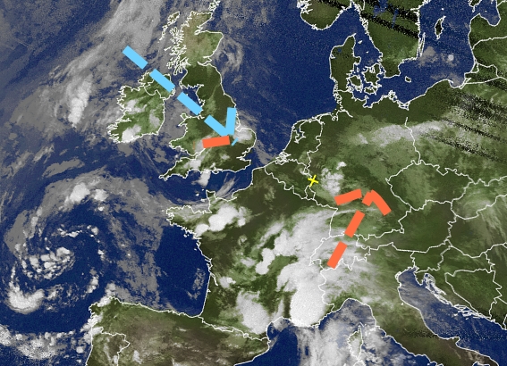 Auf dem Satellitenbild ist das Vorrücken der Kaltluft über Schottland schon zu sehen. Über Frankreich und dem Süden Deutschland zeigen die Gewittertürme feuchte und warme Luft an.
