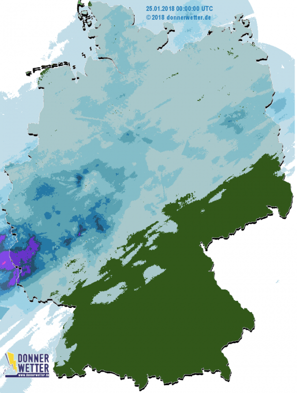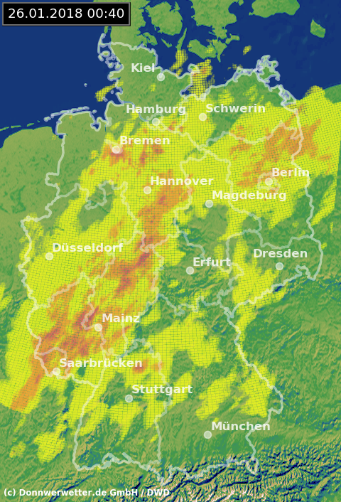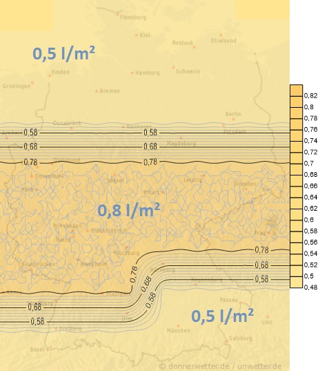 Heute tagsüber regnet es in einem Streifen vom Oberrhein über Südhessen und Thüringen bis ins südliche Brandenburg gebietsweise. Dabei liegen die Mengen jedoch allgemein unter 10 Liter pro Quadratmeter.