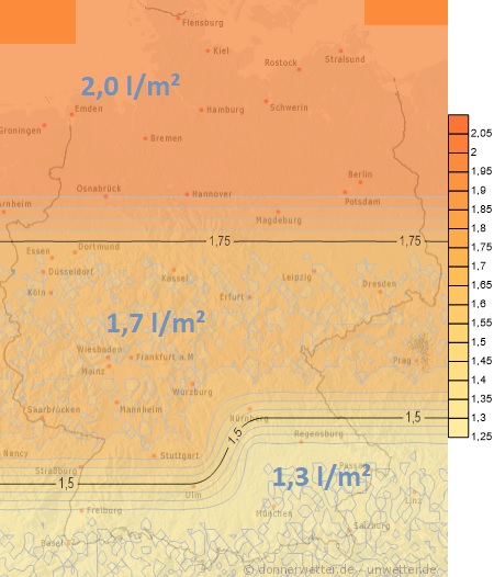 Heute fällt wieder häufiger teils kräftiger Regen oder es gehen Schauer und Gewitter nieder. Die Niederschlagsmengen liegen dabei zwischen 5 und 25 Liter pro Quadratmeter, über Hessen und Ostwestfalen stellenweise auch mehr. Ganz im Westen, sowie im Süden bleibt es jedoch bis auf wenige Ausnahmen niederschlagsfrei.