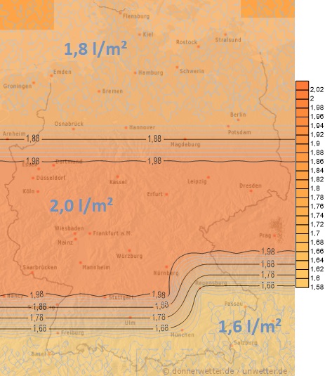 Heute treten vor allem über der Landesmitte, sowie in Teilen Bayerns teils kräftige Regengüsse auf, örtlich kann es auch blitzen und donnern. Dabei können teilweise über 10 Liter pro Quadratmeter fallen. Sonst fällt Regen eher selten.