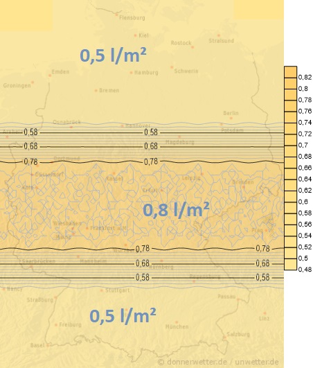 Am Samstag schiebt sich von Frankreich eine Regenzone in die Mitte und den Süden des Landes. Gebietsweise können dabei über 10 Liter pro Quadratmeter fallen. Da die Temperaturen spürbar zurückgehen, kann der Regen zum Abend in Lagen von oberhalb 300 bis 500 m in Schnee übergehen. In den Bergen wird es wieder winterlich.