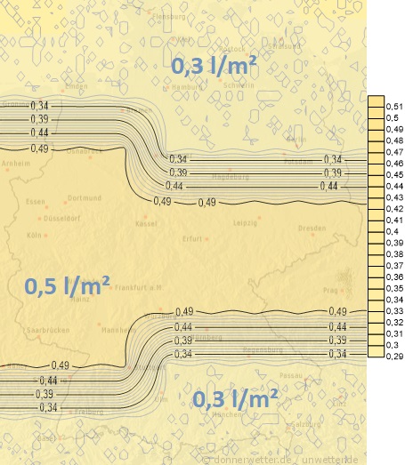 Am Montag fällt vor allem im Südwesten gebietsweise ergiebiger Regen mit Mengen von über 25 Liter pro Quadratmeter. In Verbindung mit der Schneeschmelze in den Bergen könnte sich die Hochwassersituation vor allem am Rhein und seinen Nebenflüssen wieder deutlich zuspitzen. Nach Osten fällt zunächst noch Schnee. Im Norden und Nordosten bleibt es eher niederschlagsfrei.