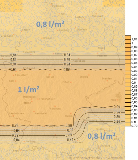 Von heute auf Dienstag zieht ein Regengebiet von Norddeutschland Richtung Süden. Dabei sind Mengen zwischen 5 und 10 Liter pro Quadratmeter zu erwarten.