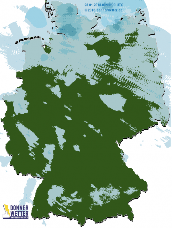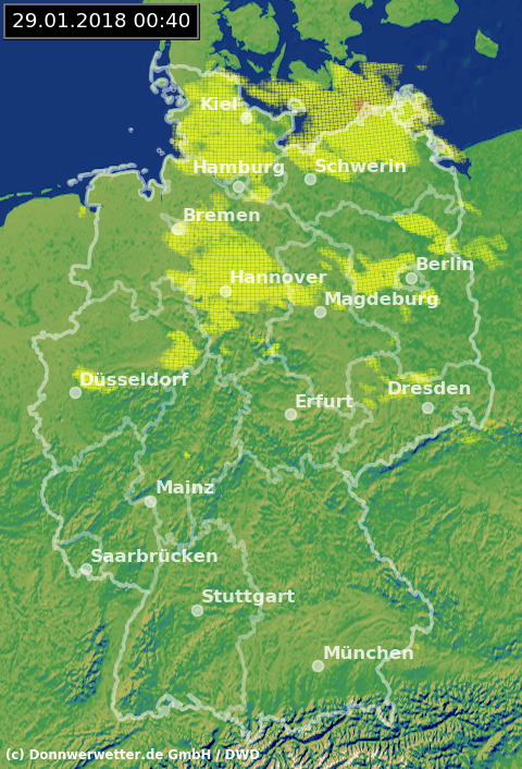 Das Radarbild zeigt aktuell über dem Norden schwache Signale mit Regen oder Sprühregen. Sonst ist der Himmel über Deutschland überwiegend wolkenverhangen und nur örtlich zeigen sich die Sterne. Stellenweise halten sich dichtere Nebelfelder.
