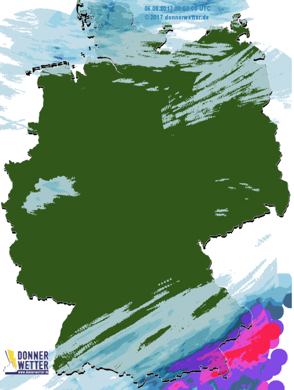 Einen nassen ersten Augustsonntag gab es gestern vor allem im hohen Norden sowie südlich der Donau. Hier wurden vor allem in Teilen Oberbayerns, dem Chiemgau sowie dem Berchtesgadener Land regionale Tagesniederschlagsmengen von >35 l/m² verbucht. In den anderen Landesteilen, z. B. im Sauerland, gab es nur geringe Niederschläge, in den meisten Landesteilen blieb es aber trocken.