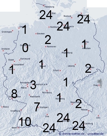 Im Südwesten setzt im Tagesverlauf Schneefall, teilweise auch gefrierender Regen ein. Sonst bleibt es überwiegend niederschlagsfrei. Die Benetzungsdauer liegt wegen des immer noch trockenen Windes zwischen 0 und 2 Stunden, im Südwesten teilweise bis zu 10 Stunden. Bei einer vorhandenen Schneedecke werden bis zu 24 Stunden erreicht.