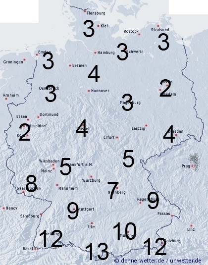 Im Süden und Südwesten muss wieder häufiger mit Schauern und Gewittern gerechnet werden. Sonst bleibt es meistens trocken. Leichte Benetzung entsteht jedoch durch nächtlichen Strahlungstau. Die Benetzungsdauer liegt im Norden und in der Mitte allgemein zwischen 2 und 5 Stunden. Im Süden können bei Regengüssen zwischen 5 und 13 Stunden erreicht werden.