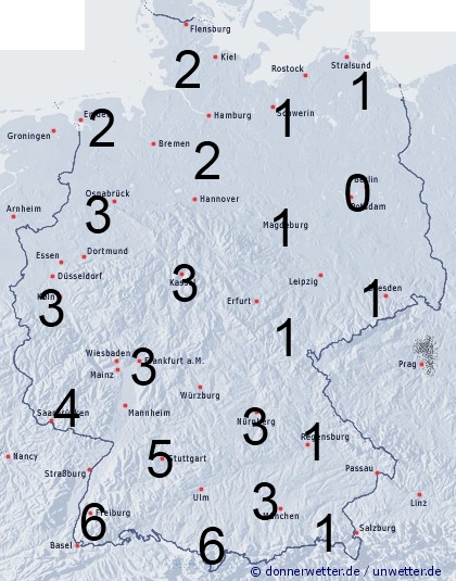 Im Nordosten bleibt es meistens noch trocken. Hier entsteht leichte Benetzung nur durch nächtlichen Strahlungstau. Sonst ziehen im Tagesverlauf von Frankreich teils gewittrige Regengüsse ins Land und sorgen für eine Benetzungsdauer meist zwischen 2 und 6 Stunden.