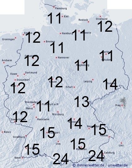 In Deutschland muss mit schauerartigen Niederschlägen gerechnet werden, die teilweise bis in tiefere Lagen mit Schnee vermischt sein können. Vor allem im Norden gibt es aber auch längere trockene Abschnitte. Sonst entsteht Benetzung auch durch Feuchtigkeit wie Tau- oder Reifansatz. Die Benetzungsdauer liegt allgemein zwischen 11 und 15 Stunden. Bei einer vorhandenen Schneedecke können aber bis zu 24 Stunden erreicht werden.