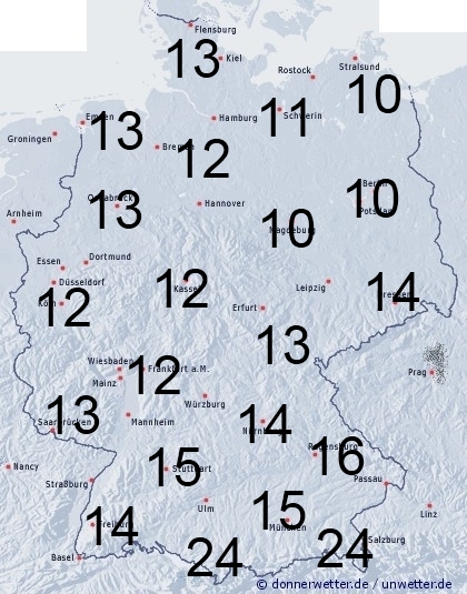 In Deutschland muss gebietsweise mit Niederschlägen oder Schauern gerechnet werden, die teilweise bis in tiefere Lagen herab als Schnee oder Schneeregen fallen können. Sonst entsteht Benetzung durch Feuchtigkeit wie Tau- oder Reifansatz. Die Benetzungsdauer liegt allgemein zwischen 10 und 16 Stunden. Bei einer vorhandenen Schneedecke können bis zu 24 Stunden erreicht werden.